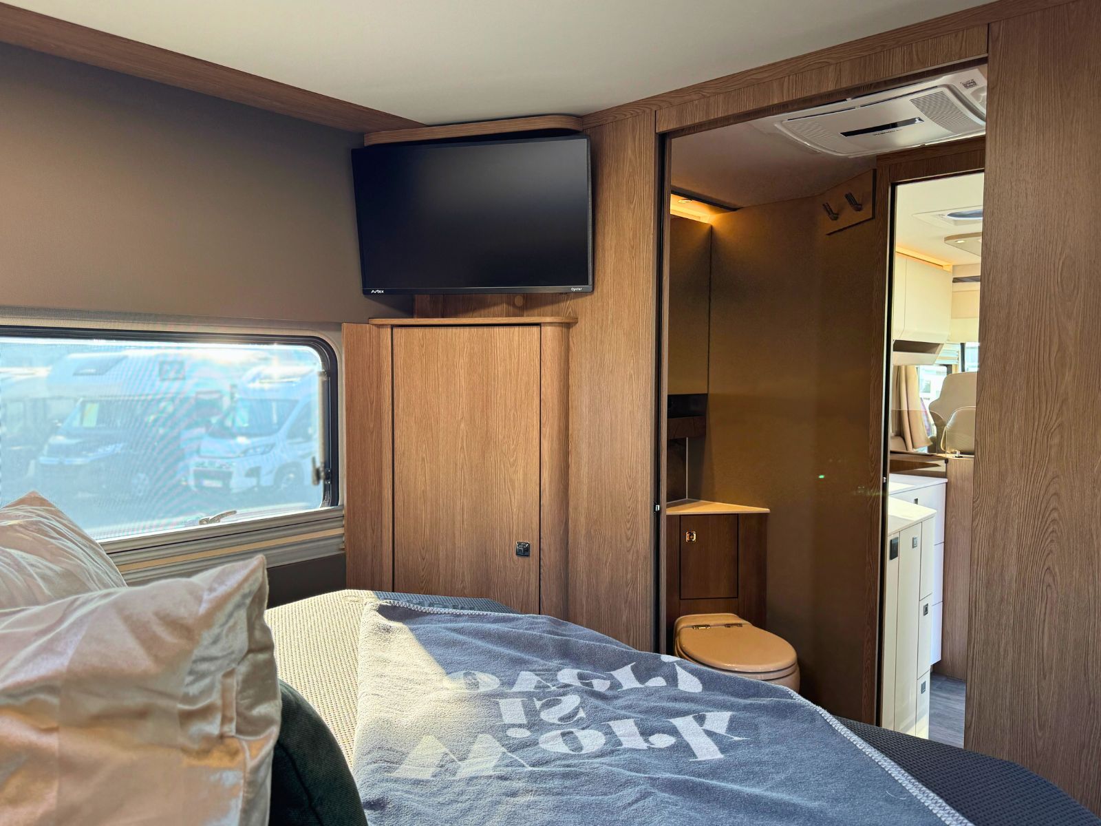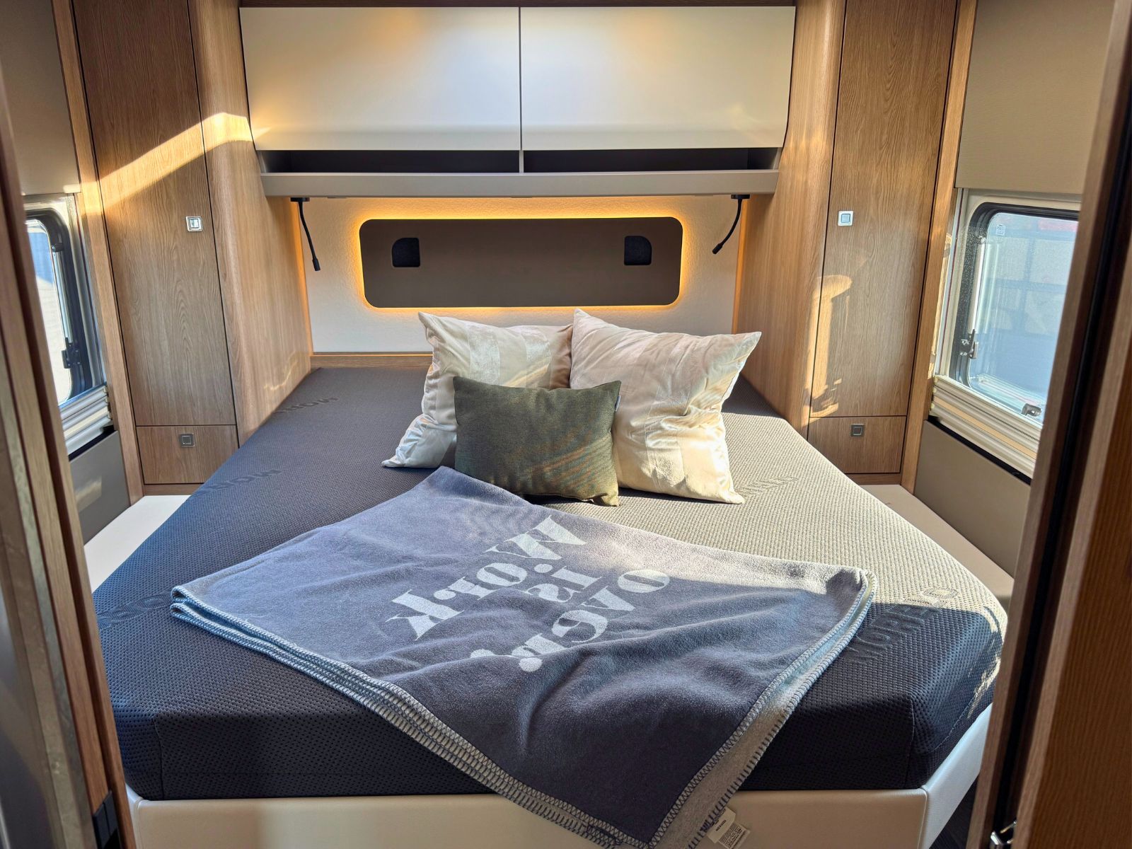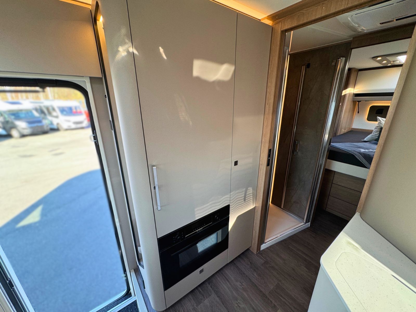 Hubbett, Backofen mit Mikrowelle, TV-Anlage, Dachklimaanlage, Solaranlage, Außendusche, Hubstützanlage mit autm. Nivellierung inkl. Touchpanel, Navi, Rückfahrkamera, AHK