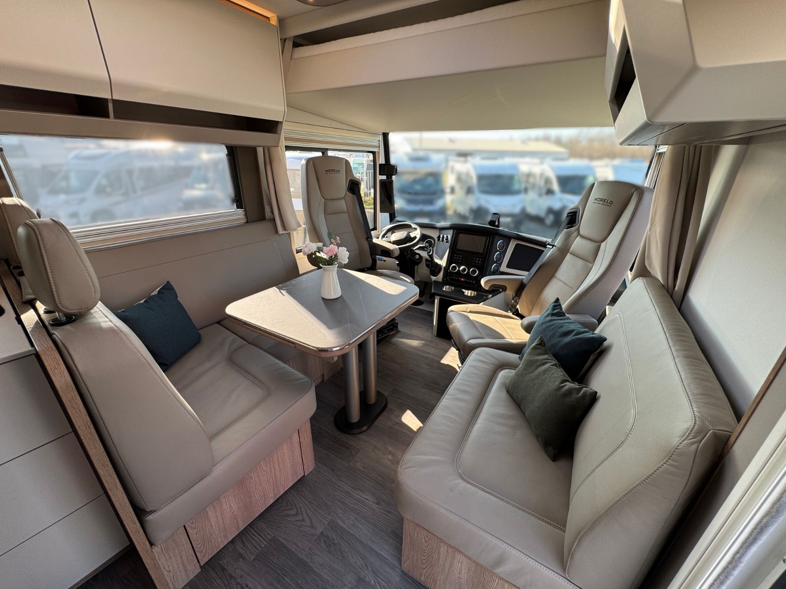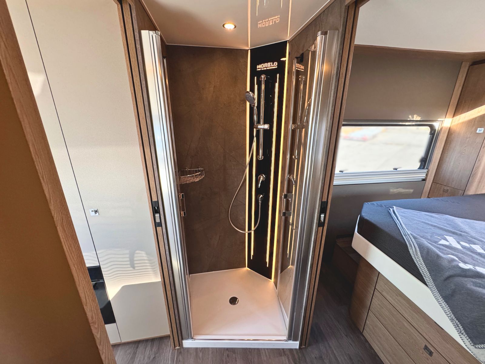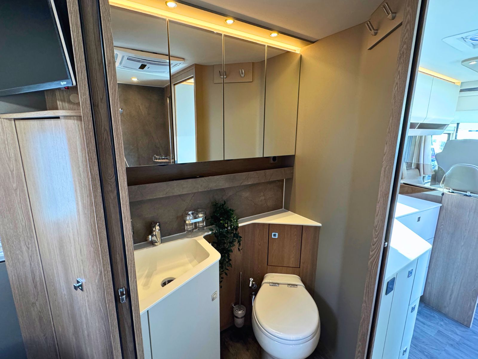 Hubbett, Backofen mit Mikrowelle, TV-Anlage, Dachklimaanlage, Solaranlage, Außendusche, Hubstützanlage mit autm. Nivellierung inkl. Touchpanel, Navi, Rückfahrkamera, AHK